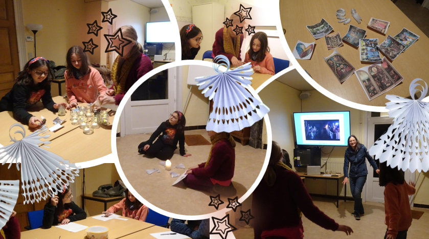 Lors de cette deuxième rencontre, nous avons découvert qui sont les anges au travers d’un grand jeu mêlant différents défis comme suivre des bougies allumées dans la nuit pour trouver des indices sur notre invité mystère (photos, œuvres d’art, plumes,…), chercher des textes dans la bible qui parlent des anges, faire un bricolage, écrire une prière, vivre un temps de chants, de prières et de louange, ….